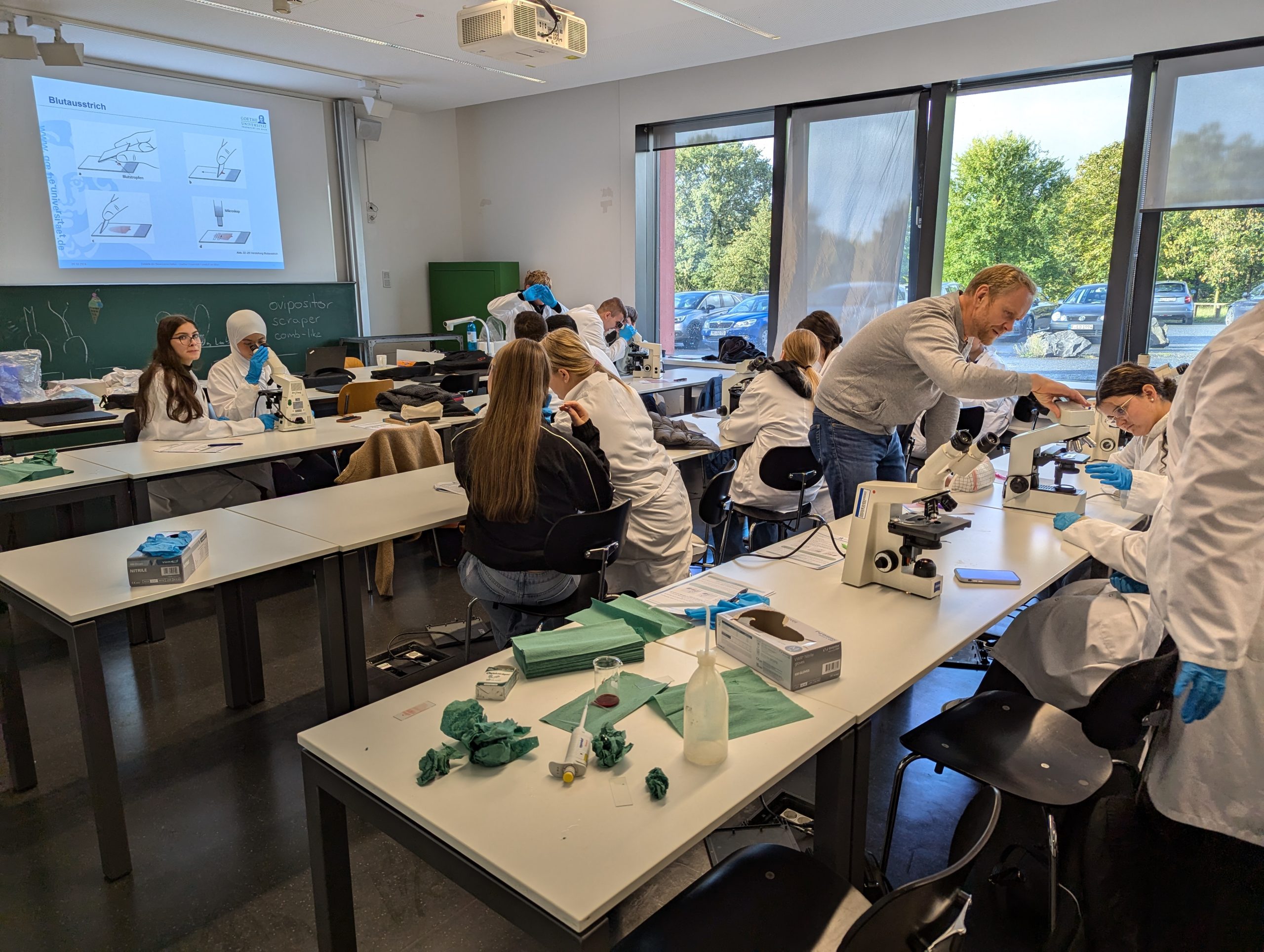 Hier bekamen die Schülerinnen und Schüler einen Einblick in biologische Arbeitsmethoden. Sie durften mit Schweineblut Blutausstriche herstellen und diese mikroskopisch untersuchen. Neben der Morphologie von Blutzellen bot sich auch die Möglichkeit ein neues „virtuelles Mikroskop“ der Biologiedidaktik zu nutzen, das bereits auch im medizinischen Bereich zum Einsatz kommt. So konnte den Schülerinnen und Schüler auch ohne direkten Kontakt mit krankheitsbedingt verändertem Blut ein Einblick in unterschiedliche Bluterkrankungen gegeben werden.